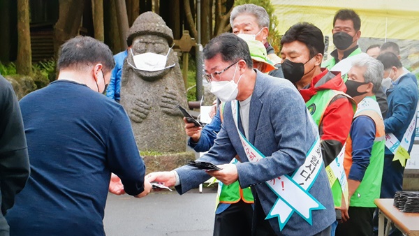 제주시와 제주시 지역자율방재단은 10일 절물휴양림에서 시민과 관광객을 대상으로 마스크를 나눠주며 생활속 마스크 쓰기 실천을 홍보했다. 강희만기자