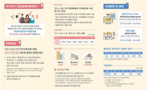 정부에서 추진하는 이번 사업은 기존 코로나19 피해 지원사업의 혜택을 받지 못하는 저소득 위기가구 중 소득이 25% 이상 감소하고, 중위소득 75% 이하이면서 재산기준이 3억5000만원 이하를 모두 충족하는 가구에 한시적으로 1회 지원한다. 지원금액은 1인가구 40만원, 2인가구 60만원, 3인가구 80만원, 4인 이상 가구는 100만원이다.