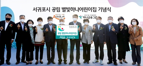 하나금융그룹은 19일 제주 서귀포에서 '공립 별빛하나 어린이집' 개원식을 가졌다고 20일 밝혔다. 개원식에서 박승 하나금융그룹 사회가치위원회 위원장(왼쪽에서 여섯번째), 함영주 하나금융그룹 부회장(왼쪽에서 다섯번째), 김태엽 제주 서귀포시장(왼쪽에서 일곱번째) 등이 기념촬영을 하고 있다.