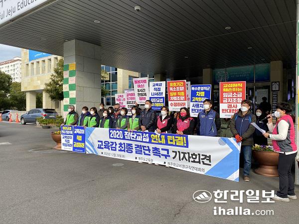 제주지역 학교비정규직연대회의는 29일 제주도교육청 앞에서 기자회견을 열고 "집단교섭 연내 타결, 제주도교육감이 직접 해결하라"고 촉구했다. 송은범기자