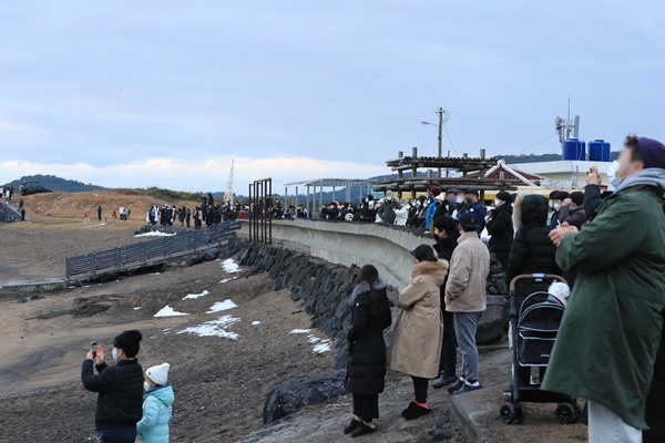 실제 이날 성산일출봉 인근 또 다른 해돋이 명소인 광치기해변은 예년보다는 아니지만, 해돋이를 보러온 도민과 관광객으로 북적였다.