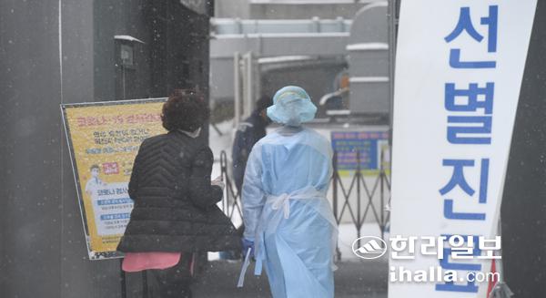 영하로 뚝 떨어진 7일 제주대학교병원 선별진료소 의료진이 추위 속에서도 업무를 하고 있다. 이상국기자