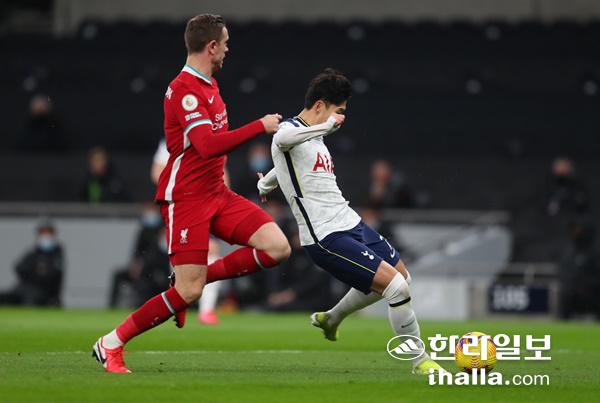 리버풀전에서 오프사이드로 취소된 손흥민의 골 장면. 연합뉴스