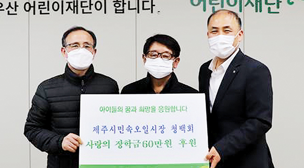 제주민속오일시장 청백회(대표 김인관)는 지난달 28일 어려운 아이들을 위해 써달라며 사랑의 장학금 60만원을 초록우산 어린이재단 제주지역본부(본부장 김희석)에 전달했다.