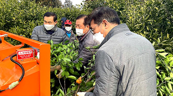 또 서귀포농업기술센터 관계자의 감귤나무 간벌 기술교육과 중문농협에서 운영 중인 간벌작업단을 주축으로 감귤나무 간벌과 파쇄작업 등 일손돕기 활동도 진행했다.