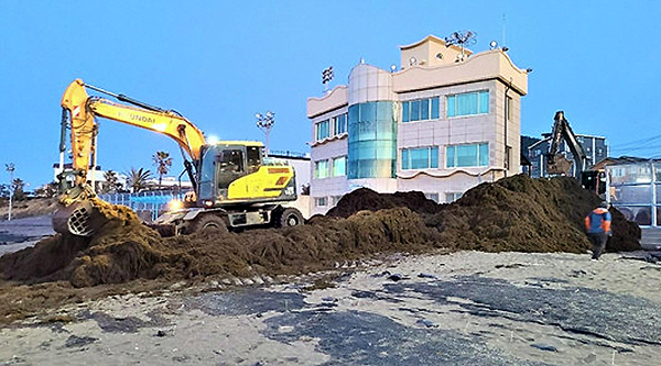 제주시 삼양동(동장 김학철)은 최근 삼양해수욕장 등 일원에서 장비기사 등 5명이 참여한 가운데 포클레인 3대 및 덤프트럭 2대를 동원해 괭생이모자반 100여t 을 수거했다. 수거한 괭생이모자반은 퇴비사용을 희망한 농가에 무상으로 제공했다.