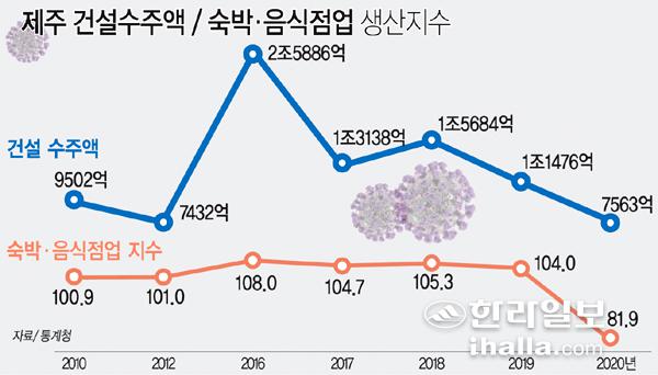 코로나19 상황이 1년 내내 이어진 지난해 제주지역 경제지표가 곤두박질치며 관련통계 작성 후 최악의 수치들이 잇따랐다. 특히 관광산업 비중이 높은 제주는 사회적 거리두기로 숙박·음식점업지수와 도소매업지수가 급락하며 최근 10년동안 가장 낮은 수준으로 떨어졌고, 건설수주액은 2013년 이후 7년만에 최저치를 기록했다.