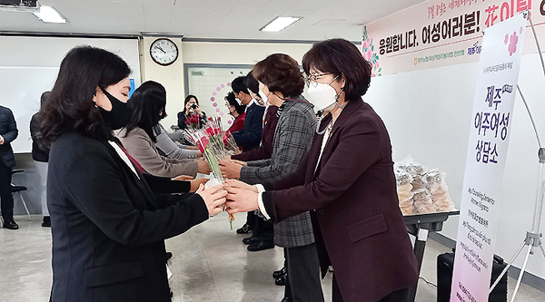 제주농협 여성책임자모임인 한란회(회장 좌순양)는 세계여성의 날을 맞아 8일 제주 폭력피해 이주여성상담소(소장 김산옥)를 방문, 사회적 약자인 소외계층 여성을 응원하고 격려의 의미로 장미꽃과 우리쌀 빵 300세트를 전달했다. 전달받은 빵과 장미는 묵묵히 인권보호에 힘쓰고 있는 제주여성인권상담소와 시설협의회 소속 18개 단체에 나누게 된다.