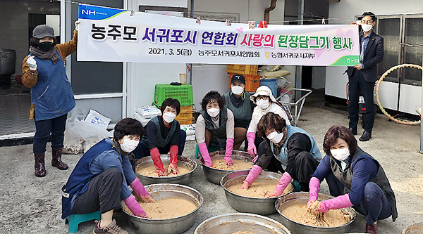 농협 서귀포시지부(지부장 현학렬)와 농가주부모임 서귀포시연합회(회장 현효숙)는 지난 5일 중문 오성된장에서 취약계층에게 지원할 된장 담그기 행사를 가졌다.