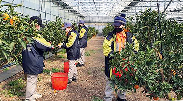 서부소방서 애월119센터 애월남성의용소방대(대장 윤이하)와 애월여성의용소방대(대장 김명숙)는 최근 코로나19로 어려움을 겪고 있는 제주시 애월읍 납읍리 소재 비닐하우스 농가를 방문해 감귤 수확 봉사활동을 실시했다.