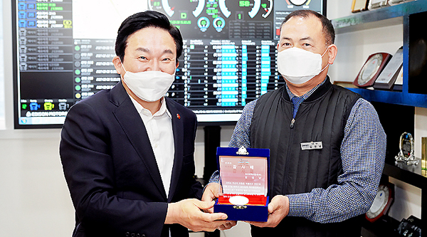 원희룡 제주도지사는 8일 제주여객 사무실에서 '시민영웅 버스기사' 김상남씨에게 감사패를 전달했다.