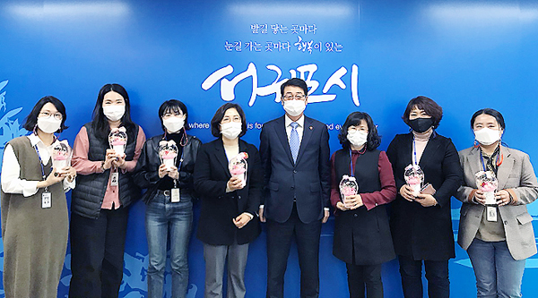 김태엽 시장은 8일 세계 여성의 날을 맞아 접견실에서 서귀포시청 여성공직자회(회장 김금자) 임원 7명과 간담회를 갖고 일과 육아를 병행하는데 따른 애로사항을 청취하고 그동안의 노고에 대해 격려했다.
