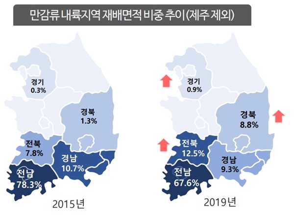 이 날 김원태 한국농촌경제연구원 연구원의 '감귤 수급동향과 전망' 발표에 따르면 만감류의 내륙지역 재배면적 비중은 2015년 3.3%에서 2019년 3.7%로 확대됐다. 2019년 기준 내륙지역 재배비중은 전남이 67.7%로 가장 높았고 전북 12.5%, 경남 9.3%, 경북 8.8%, 경기 0.9% 순으로 나타났다. 전북, 경북, 경기 지역 재배면적은 2015년 대비 각각 5%포인트(p), 8%p, 1%p 상승했다.
