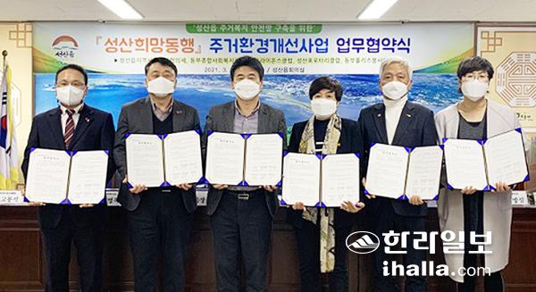 성산읍(읍장 강기종)은 지난 9일 읍사무소에서 성산희망동행 주거환경개선사업 추진에 따른 업무 협약식을 개최했다. 사업은 성산읍지역사회보장협의체 특화사업으로 희망나눔 캠페인으로 조성된 모금액으로 추진되고 있다.