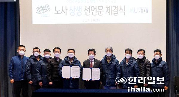 제주특별자치도개발공사(사장 김정학)와 제주개발공사 노동조합(위원장 허준석)은 지난 9일 제주시 조천읍 교래리 삼다수공장에서 창립 26주년 기념행사와 함께 노사 상생 선언문 체결식을 가졌다.