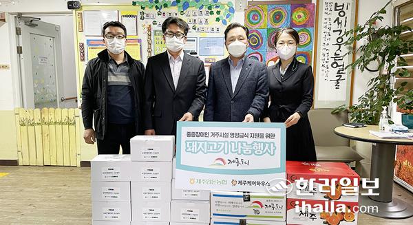 제주양돈농협(조합장 고권진)은 지난 16일 제주시 영평동 소재 중증장애인거주시설인 제주케어하우스(원장 이미정)에 중증장애인의 영양급식 지원을 위한 나눔행사 사회공헌활동의 일환으로 돼지고기를 전달했다.