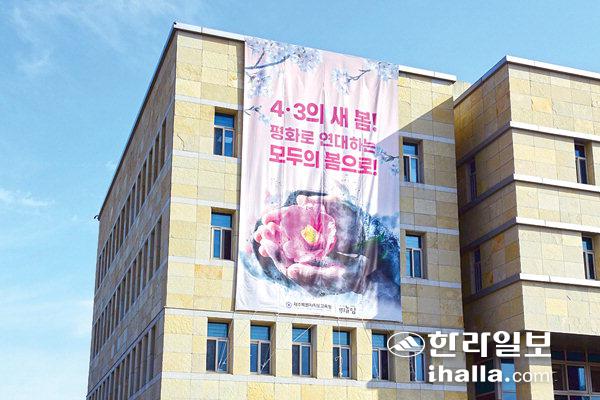제주특별자치도교육청은 제73주년 제주4·3을 추념하는 대형 현수막을 본청 건물에 게시해 4·3 추념 분위기를 확산하고 있다. 추념 문구는 '4·3의 새봄! 평화로 연대하는 모두의 봄!'이다.