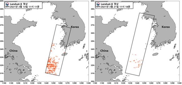 수산과학원에서는 지난 14일과 21일 미국 위성 영상자료를 분석한 결과 흑산도 서쪽에서 동중국해 북부 해역(북위 31∼35도, 동경 124∼127도)까지 넓은 범위에 걸쳐 약 200만∼500만t가량 괭생이모자반이 분포된 것을 확인했다.