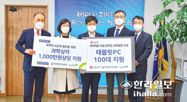 제주특별자치도교육청은 지난 25일 LG유플러스(대표 황현식)에서 태블릿PC 100대, (주)신동아문구(대표 박경란)에서 과학상자(1000만원 상당)를 기증했다고 밝혔다.