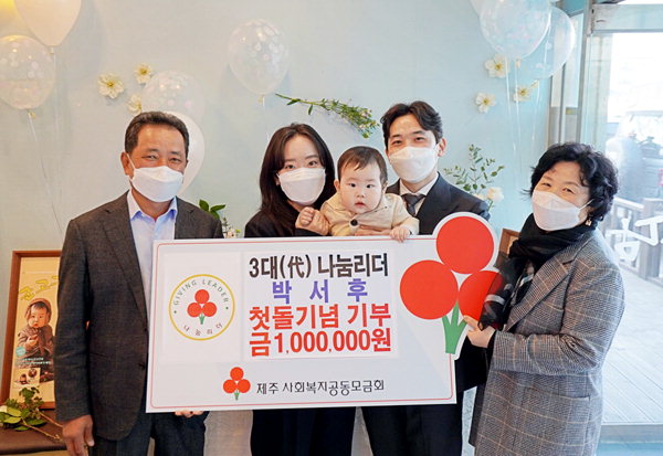 박서후(1세·오라동)군이 지난 26일 가족들과 함께 제주시 미소담에서 첫돌 기념 100만원을 기탁하며 나눔문화 확산에 앞장서는 제주 나눔리더로 가입했다.