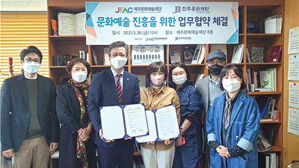 제주문화예술재단(이사장 이승택)은 지난 26일 (재)전주문화재단(대표이사 백옥선)과 상호교류와 협력을 통해 지역의 문화예슬 진흥을 도모하기 위한 업무협약식을 가졌다.