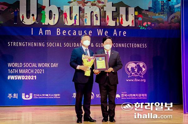 원희룡(사진 오른쪽) 제주특별자치도지사가 30일 한국사회복지사협회 주관 '제1회 지방자치복지대상'에서 광역자치단체 부문 대상을 수상했다.