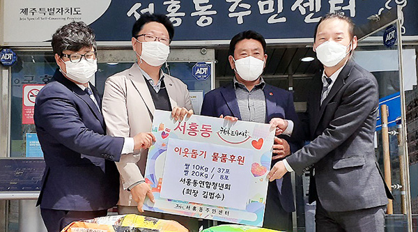 서귀포시서홍동연합청년회(회장 김법수)는 지난달 31일 지역내 어려운 이웃을 돕기 위해 쌀 550㎏을 서홍동주민센터에 기탁했다. 이날 전달된 물품은 지난달 27일 개최된 2021년도 서홍동연합청년회 회장단 및 감사 이·취임식에서 받은 쌀 화환으로 마련됐다. 김법수 회장은 "도움의 손길이 필요한 분들을 위한 봉사를 통해 따뜻하고 행복한 서홍 공동체를 만들어 나가겠다"고 말했다.