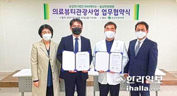 솔담한방병원(병원장 현경철)은 지난 2일 솔담디자인서비스센터에서 한국의 우수한 한의학과 제주산 마유를 소재로 한 화장품으로 제주 의료·뷰티 관광의 새로운 장을 열기 위해 농업회사법인 (주)비케이수(대표 김기범)와 업무 협약식을 가졌다고 5일 밝혔다.