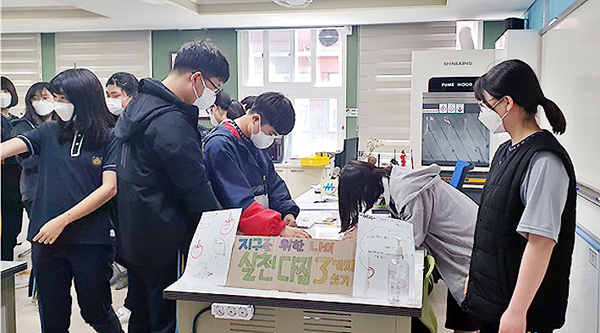이날 효돈중학교 생태환경 동아리 학생들이 직접 제작한 식목일 캠페인 영상이 상영됐고 지구를 위한 실천 다짐 3가지를 적은 학생들에 묘목과 화분을 나눠줬다.