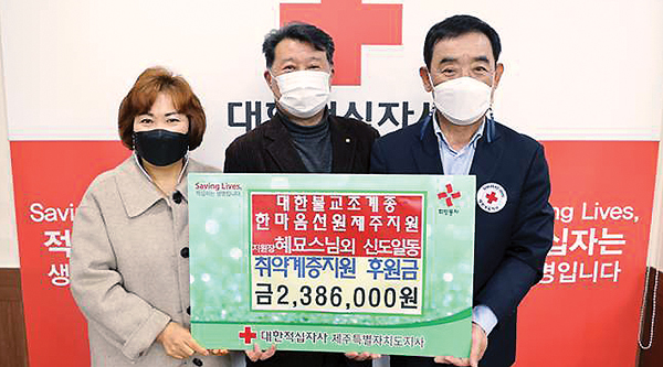 대한불교조계종 한마음선원제주지원(지원장 혜묘스님, 신도회장 장언식)은 지난 5일 적십자사 회장실에서 대한적십자사제주특별자치도지사(회장 오홍식)에 취약계층 지원 후원금 238만원을 기탁했다.