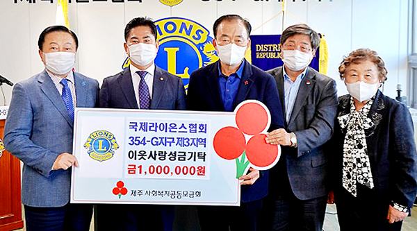 국제라이온스협회 354-G지구 제3지역(지역부총재 한재일)은 지난 5일 지구 사무실에서 어려운 이웃을 돕기 위한 성금 100만원을 제주사회복지공동모금회(회장 김남식)에 기탁했다.