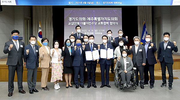 경기도의회 더불어민주당(대표의원 박근철)과 제주특별자치도의회 더불어민주당(원내대표 김희현)은 지난 9일 경기도의회 대회의실에서 '경기도의회·제주특별자치도의회 교섭단체 더불어민주당 교류·협력 협약식'을 개최했다.
