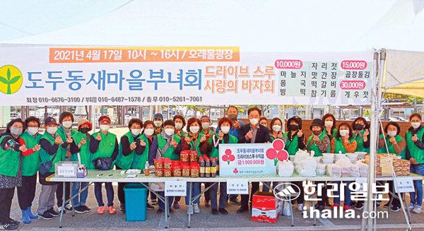 도두동새마을부녀회(회장 김병화)는 지난 17일 제주시 도두1동 소재 오래물광장에서 드라이브스루 사랑의 바자회를 진행하고 수익금 100만원을 제주사회복지공동모금회(회장 김남식)에 기탁했다. 이번 성금은 도두동 암투병 환자의 의료비로 지원될 예정이다.