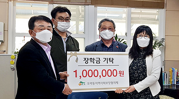 제주시 오라동지역사회보장협의체(민간위원장 양국남)는 지난 20일 오라초등학교를 방문해 코로나19로 어려운 아동 가정을 위해 장학금 100만원을 기탁했다.