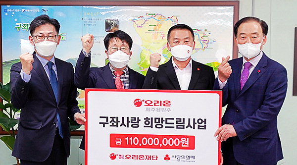 (주)오리온제주용암수(대표이사 현종훈)와 (재)오리온재단(이사장 이경재)은 지난 20일 구좌읍사무소와 성산읍사무소에서 제주사회복지공동모금회(회장 김남식)에 희망성금 2억1000만원을 기탁했다.