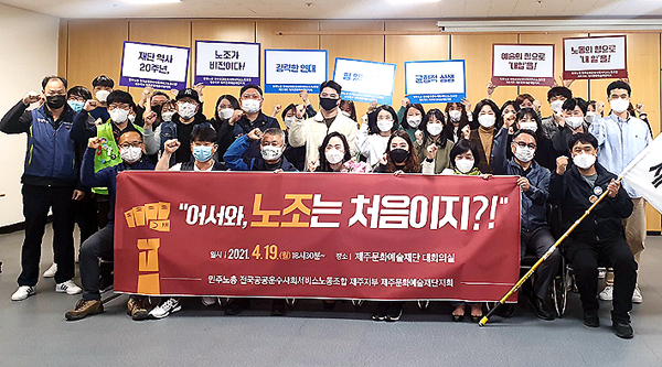 민주노총 전국공공운수노조사회서비스 제주지역본부 제주지부 제주문화예술재단지회(지회장 국혜원)는 지난 19일 전진대회를 열었다.