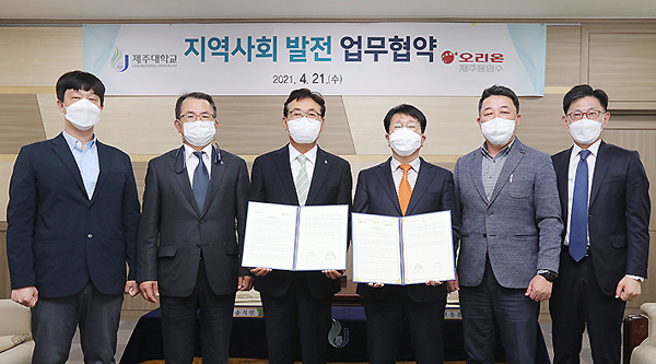 제주대학교(총장 송석언)와 (주)오리온제주용암수(대표이사 현종훈)는 21일 제주대에서 제주 지역사회 발전을 위한 업무협약을 체결했다.