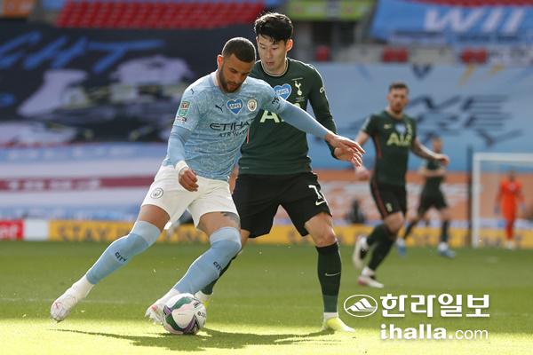 맨시티의 카일 워커와 볼 경합을 펼치는 손흥민(오른쪽). 연합뉴스