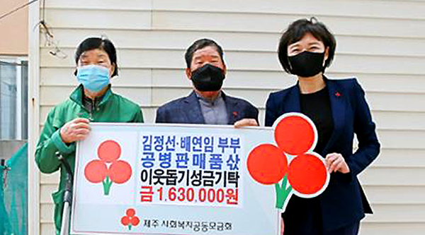 제주시 구좌읍 김녕리에 거주하는 김정선(82)·배연임(78) 부부는 지난 22일 공병을 팔아 모은 성금 163만원을 제주사회복지공동모금회(회장 김남식)에 기탁했다.