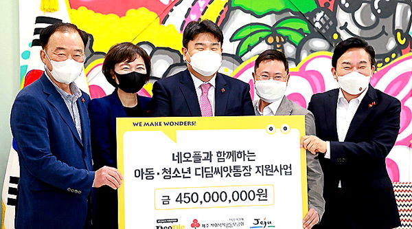 (주)네오플(대표이사 노정환)은 26일 제주도청에서 제주사회복지공동모금회(회장 김남식)·제주도와 아동·청소년 디딤씨앗통장 지원사업을 위한 업무협약 체결을 통해 3년간 총 4억5000만원을 기부하기로 결정했다.