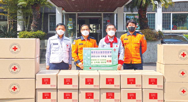 대한적십자사제주특별자치도지사(회장 오홍식)는 최근 적십자사 앞마당에서 KF94 마스크 4000장과 손소독제 800개 등 코로나19 예방물품을 제주소방안전본부(본부장 박근오)에 전달했다.