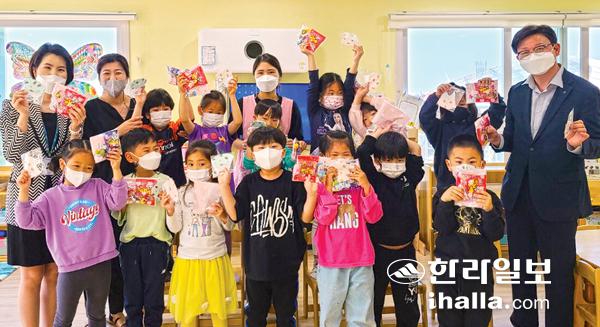 농협은행 서귀포지점(지점장 고정용)은 지난달 30일 서귀포시 오렌지몬테소리 어린이집(원장 고은희)과 내담어린이집(원장 이희영)을 방문해 코로나19 감염 방지용 어린이 전용 마스크와 과자종합선물 세트를 기탁했다.