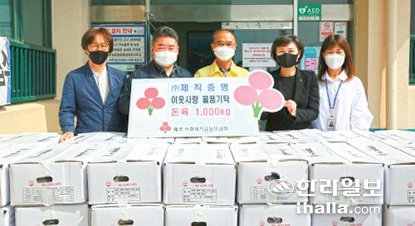 농업회사법인 (주)제직증명(대표 고도호)은 지난 3일 제주시 한림읍사무소 임시청사에서 어려운 이웃들을 위해 제주사회복지공동모금회(회장 김남식)에 돈육 1000㎏을 기탁했다.