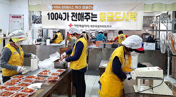 대한적십자사제주특별자치도지사(회장 오홍식)는 지난 4일부터 7일까지 신협 두손모아봉사단(단장 여혜숙)과 적십자봉사원 40여 명이 참여한 가운데 취약계층 400가구에 사랑의 어멍촐레 밑반찬을 만들어 전달하고 있다.