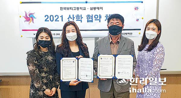 한국뷰티고등학교(교장 홍남호)는 지난 12일 제주시 아라동에 위치한 헤어숍 살롱에이(원장 이정림)와 산학협약으로 상호 간 긴밀한 협력 체제를 구축해 뷰티고의 특성화 추진 및 뷰티 산업 발전을 위해 공동 노력하기로 했다.