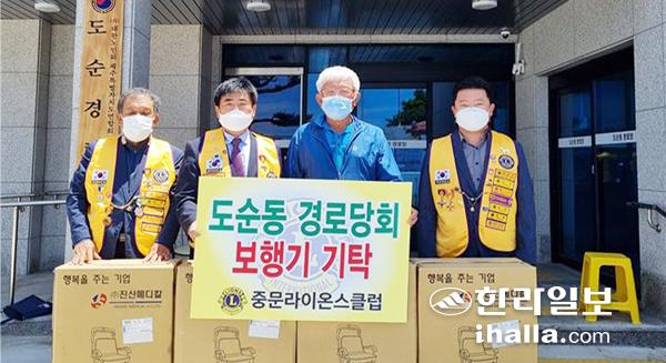 국제라이온스협회 354-G지구 중문라이온스클럽(회장 고부영L)은 지난 18일 서귀포시 도순동, 하원동 경로당을 방문해 보행기 각 4대씩을 기탁하는 한편 중문경로당 발전기금으로 봉사금 50만원을 전달했다.