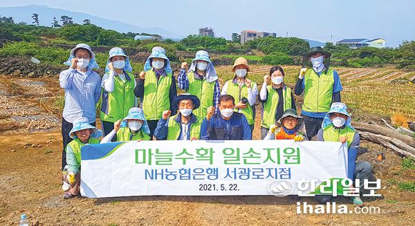 농협은행 서광로지점(지점장 송진원)은 지난 22일 전직원이 참여해 제주시 조천읍에서 마늘수확 일손돕기를 벌였다. 이번 일손돕기는 코로나19 장기화와 농촌지역 고령화로 일손 확보에 어려움을 겪는 농가의 마늘밭에서 진행됐다.