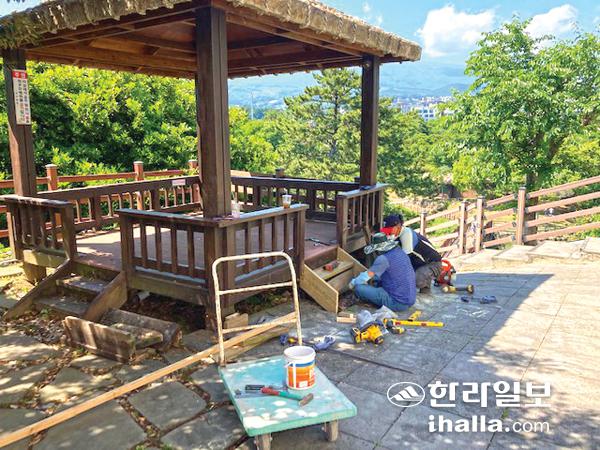 서귀포시 천지동(동장 허종헌)은 오는 29일 개장 예정인 '하영올레' 탐방객과 지역주민에 대한 편의 제공을 위해 '풍경있는 오솔길' 내 쉼터(정자) 및 울타리 등 편의시설을 재정비했다.