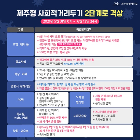 제주특별자치도는 오는 31일 0시를 기해 사회적 거리두기를 1.5단계에서 2단계로 격상한다고 28일 발표했다.