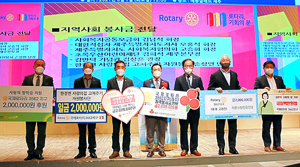 국제로타리3662지구(총재 고권진)는 지난 1일 메종글래드 제주 컨벤션홀에서 7년차 지구대회를 개최하고 제주사회복지공동모금회(회장 김남식)에 봉사금 200만원을 전달했다.
